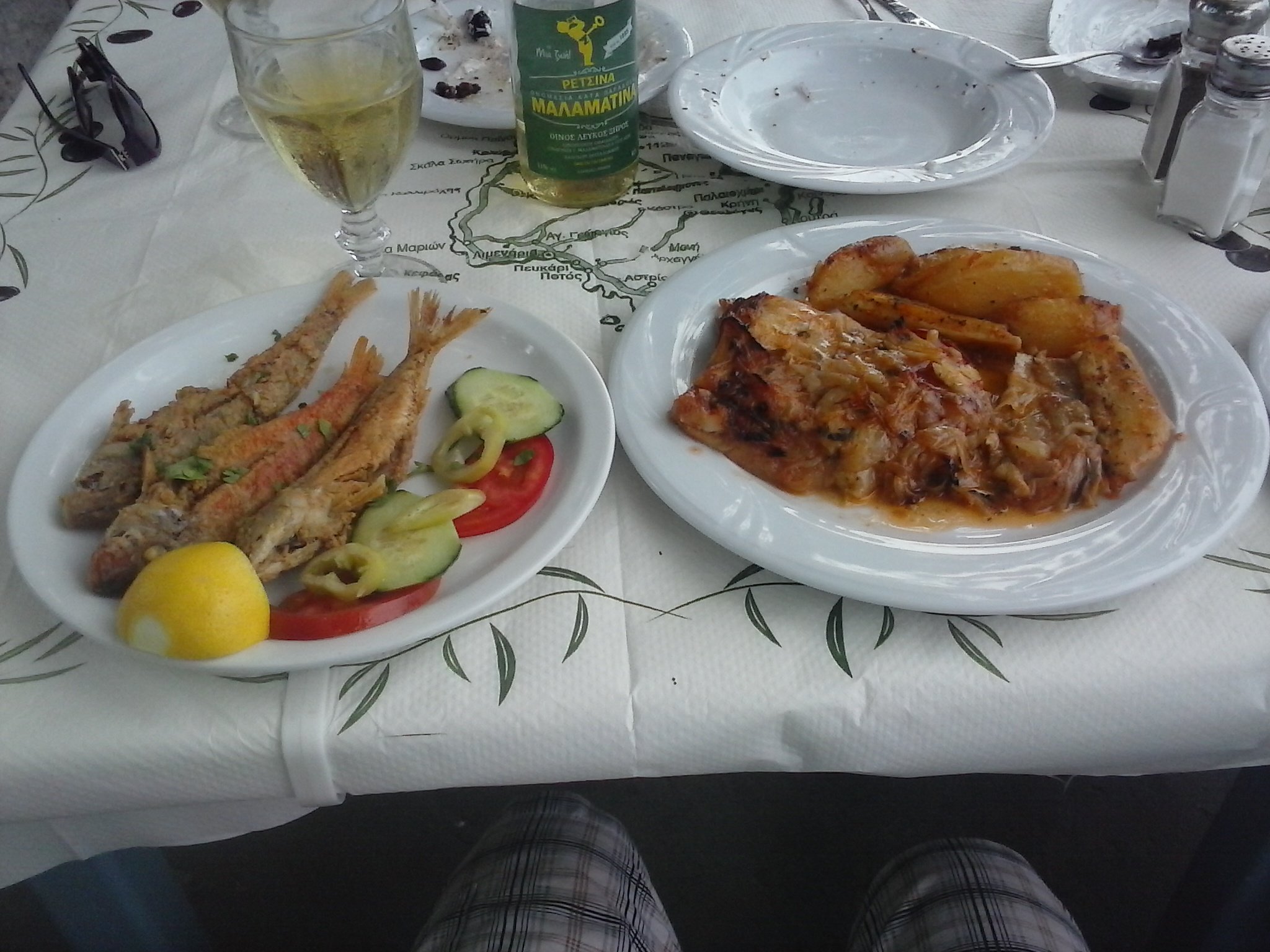Mutta takasin aiheeseen: vasemmalla kuvassa koutsoumoura -fisua ja oikealla fish plaki -niminen annos. Ensimmäinen 5/5 ja toinen 4,5/5 koska suurimmat perunat oisivat voineet olla keskeltä pehmeämpiä.