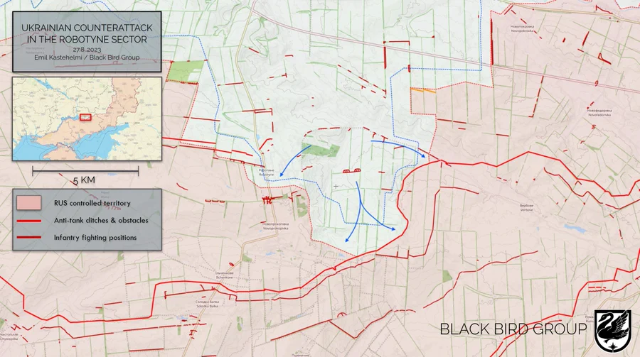 ISW vahvisti että Ukraina saavutti pientä edistymistä Robotynen alueella. Joukot ovat edenneet n. 5 kilometriä Robotynestä kaakkoon eli Tokmakin suuntaan.